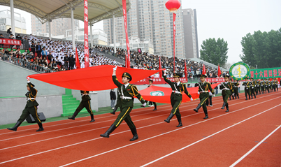 首先进行的是运动员入场式,在雄壮的运动员进行曲中,国旗队、校旗校徽队、彩旗队,以及裁判员、运动员方阵依次入场。入场完毕后,全体起立奏唱《中华人民共和国国歌》,郭万周同志宣布组委会及仲裁委员会名单,逵应坤同志致开幕词,体育教学部武乐宁老师、临床医学系赵冰阳同学分别代表裁判员及运动员进行宣誓,逵应坤宣布“南阳医专第十六届田径运动会开幕”后,进行了精彩文体汇演。