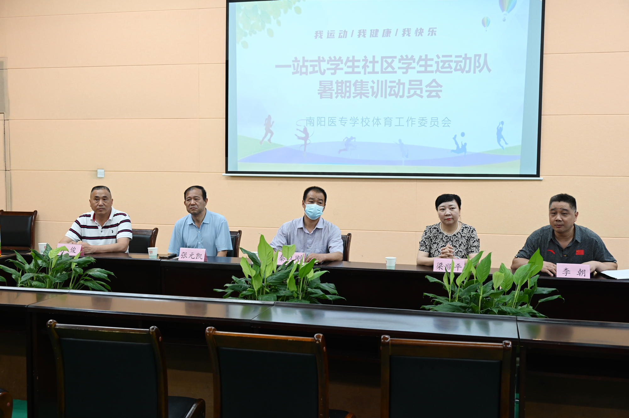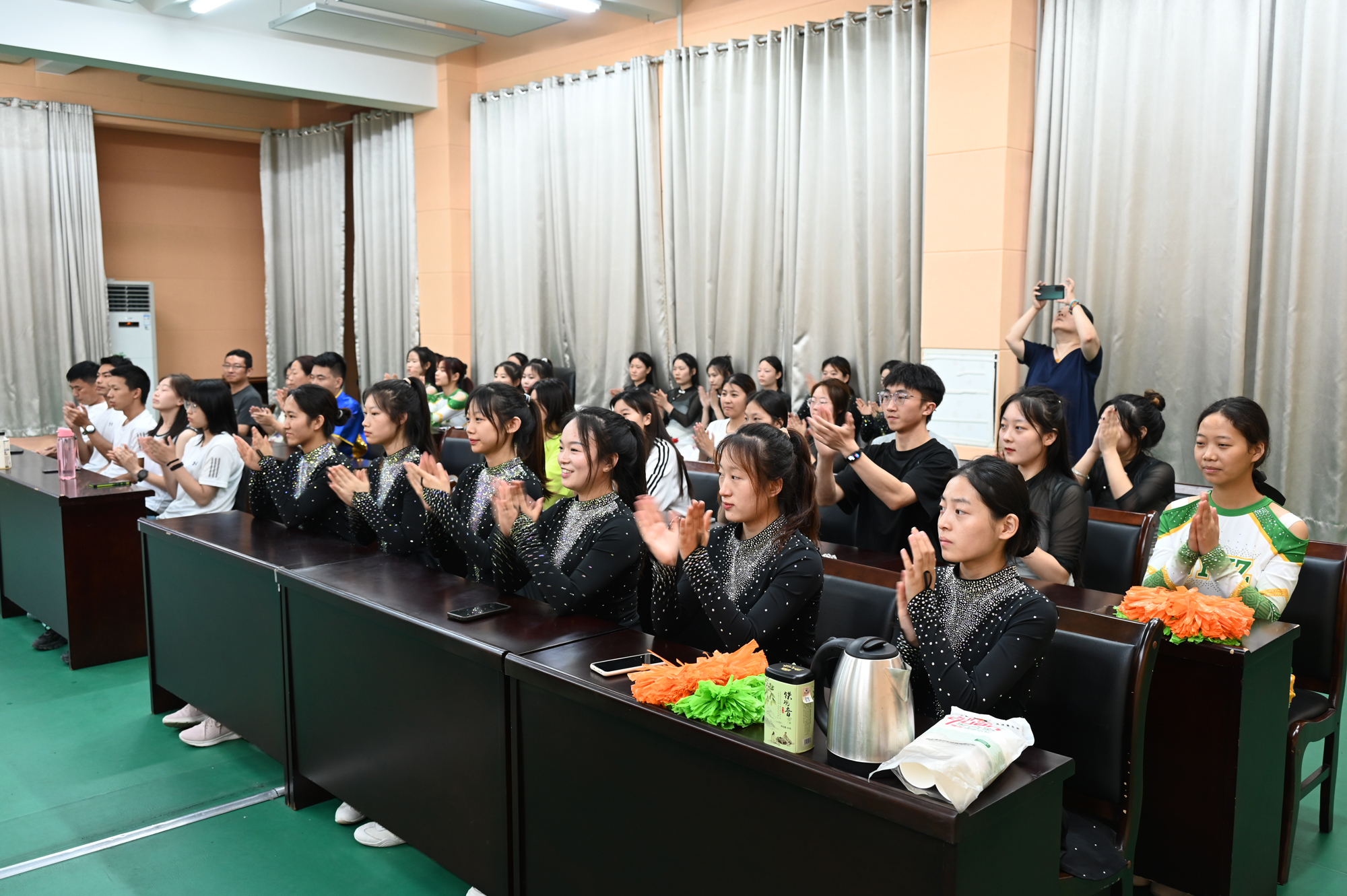 秦玖刚副校长一行与教练员和运动员进行了面对面座谈,询问了解学生们训练生活中的实际困难,协调解决了学生集中住宿和就餐问题。并向在炎炎暑期坚持训练的教练员和运动员表示问候,叮嘱大家在做好训练的同时保重身体、注意休息,在训练期间要注意营养和安全。梁顺平处长鼓励同学们要团结拼搏、刻苦训练、遵守纪律、确保安全。张元凯主任表示,一定服务好训练队的住宿,并为队员们提供早餐牛奶。之后,健美操、啦啦操、武术队的选手为领导们进行了汇报表演。