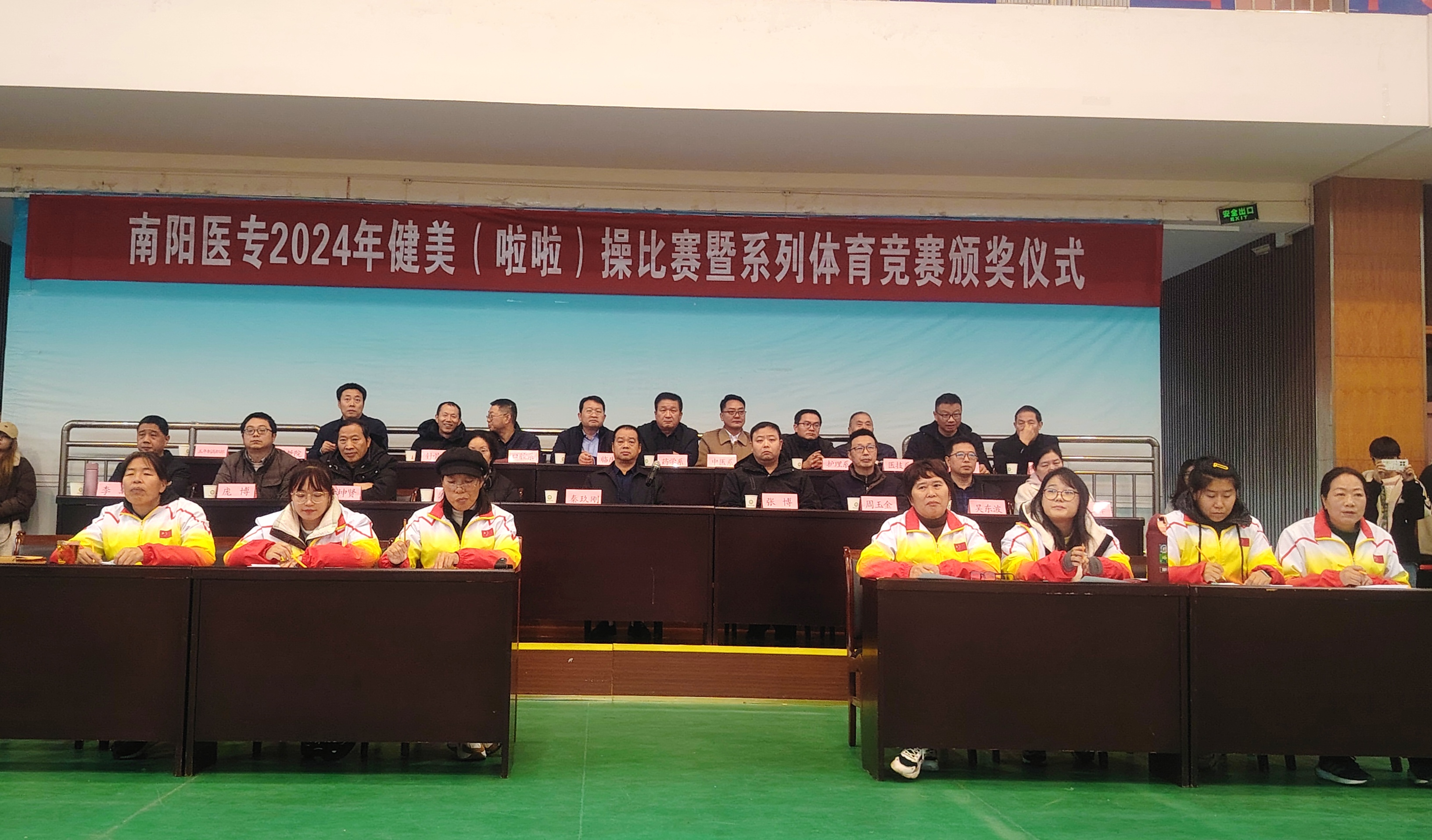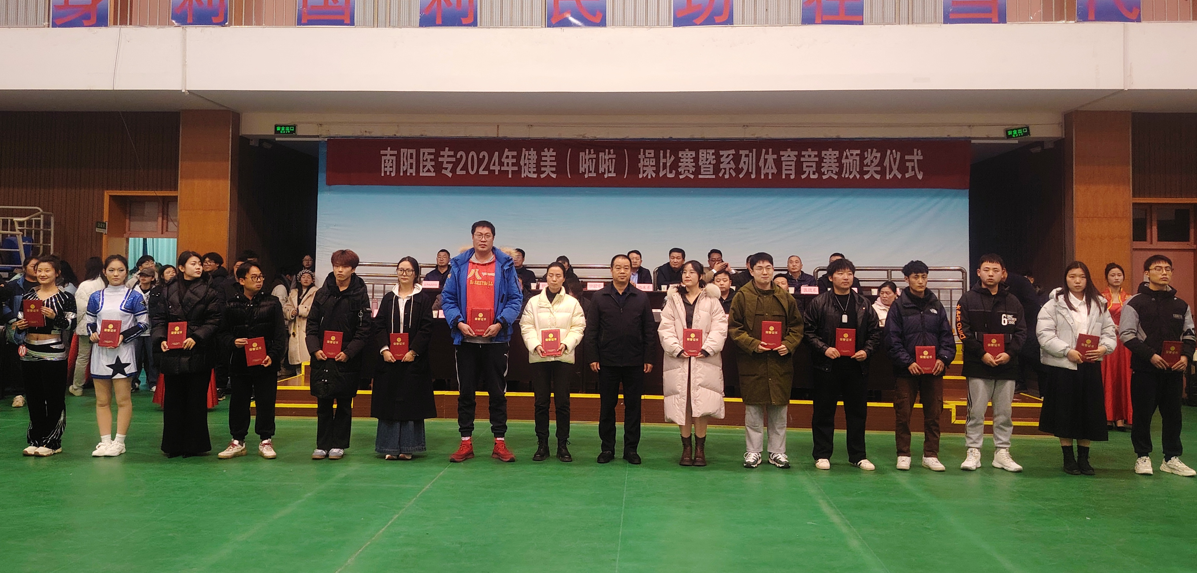 2024年12月4日下午,南阳医专2024年健美操啦啦操(舞)比赛暨体育系列比赛颁奖仪式在学校仲景西区体育训练馆成功举办。