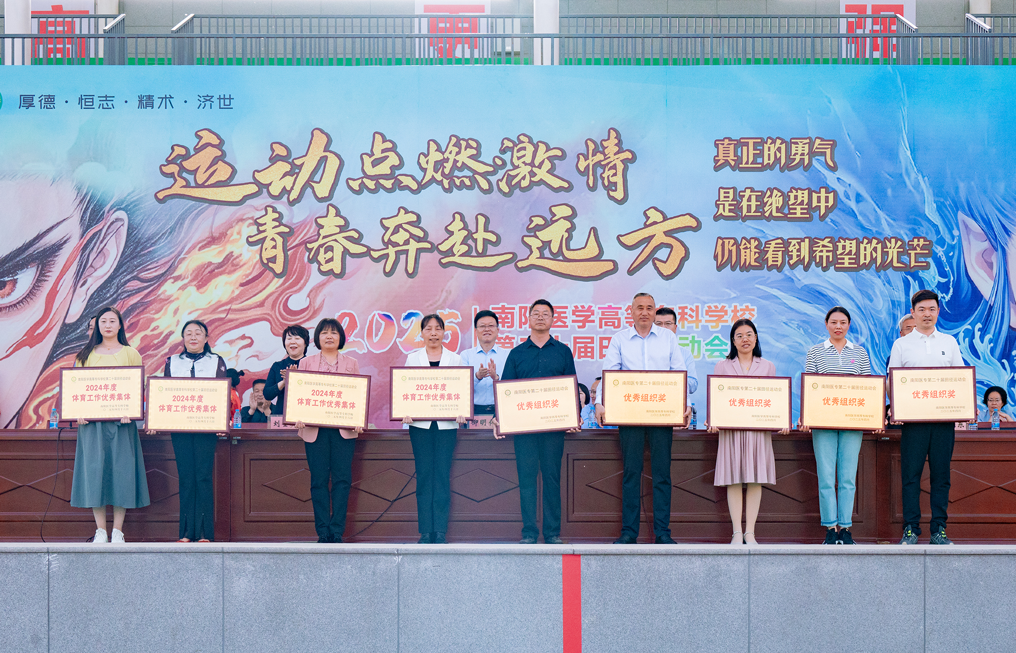 仪式现场颁发2024年体育工作优秀集体奖、运动会优秀组织奖。国际教育学院、护理系、口腔医学系、临床医学系获优秀集体奖;口腔医学系、临床医学系、太阳网集团tcy8722、医学技术系、中医系获优秀组织奖。