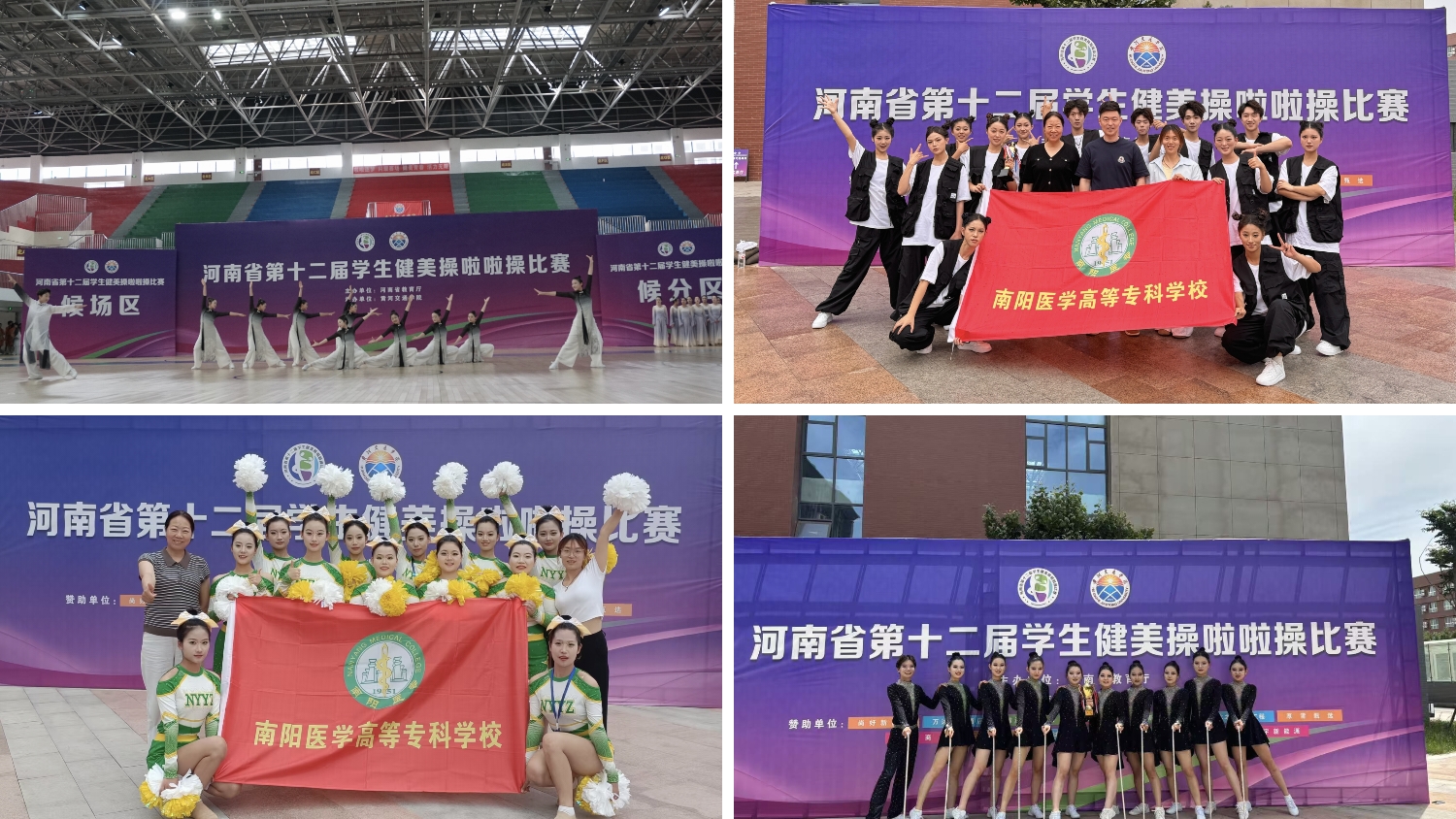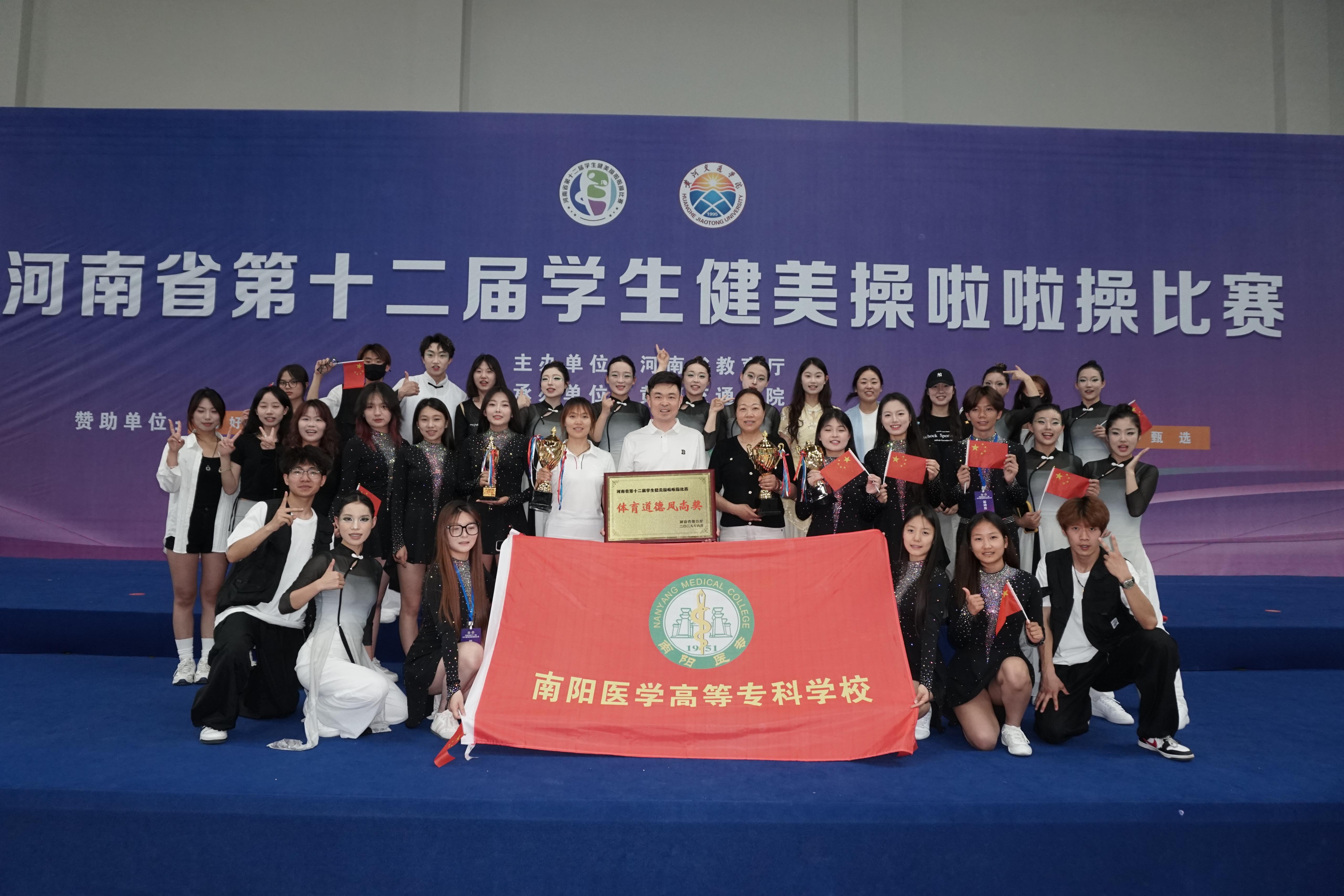 5月29日-6月4日,为期7天的河南省第十二届学生健美操啦啦操比赛在黄河交通学院举行。我校来自护理系、临床医学系、口腔系、国际教育学院、医技系、药学系、中医系、健康管理系、针骨系的33名运动员分别获得排舞自选动作第一名、街舞自选动作第一名、街舞规定动作第三名、健美操轻器械第二名、啦啦操花球第四名,并获得体育道德风尚奖。