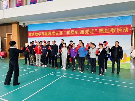 4月16日下午,在体育馆一楼举办了体育教学部直属党支部“学党史 跟党走”唱红歌活动。参与本次活动人员主要有体育教学部领导班子成员、全体党员和全体教职工。