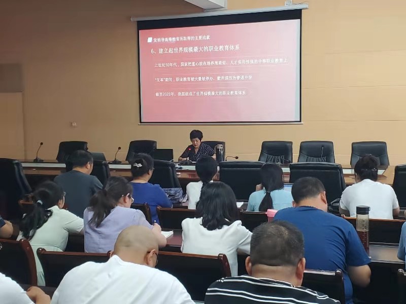 范真从我国高等教育的历史变迁、取得的主要成就以及今后的发展方向三个方面,阐述了我国高等教育事业的发展历程。在中国共产党的英明正确领导下,我国高等教育从改造旧的教育体制、创建中国特色的高等教育体系到高等教育大众化、普及化目标的实现,从无到有、从弱到强,取得了辉煌的发展成就。然后,她对我国高等职业教育及“双高校”建设现状进行了详实的分析,希望全体党员干部要负起推进“双高校”建设的责任担当,以加强师资队伍建设、落实立德树人根本任务为基本抓手,认真落实我校“高职双高工程”建设和“提质培优行动计划”相关工作。