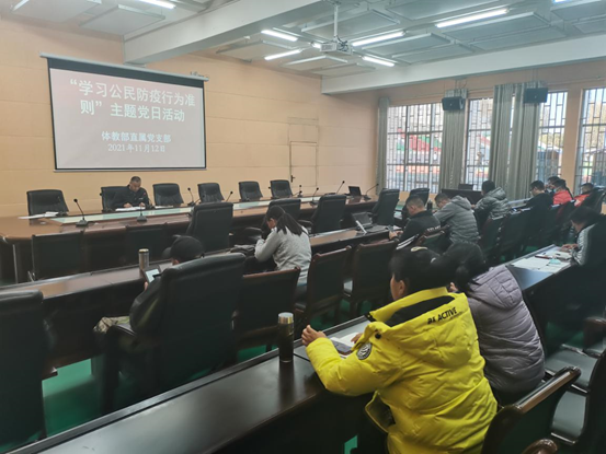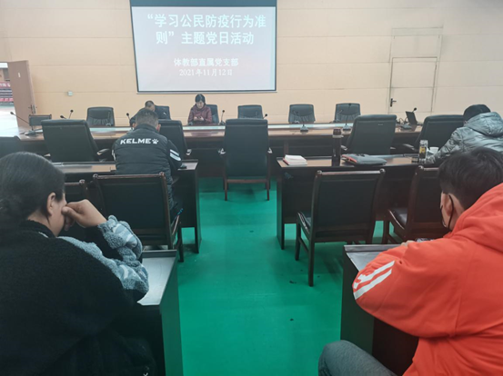 根据中共南阳市委组织部《关于在全市开展“学习公民防疫行为准则”主题党日活动的通知》(宛组电[2021]43号)精神要求,和按照南阳医专《关于在全校开展“学习公民防疫行为准则”主题党日活动的通知》的工作部署,体育教学部直属党支部于11月12日下午组织开展“学习公民防疫行为准则”主题党日活动: