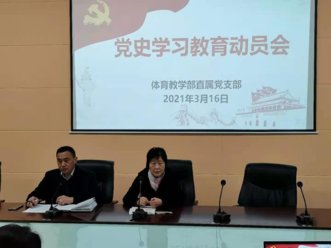 3月16日下午,体育教学部直属党支部在体育馆一楼会议室对全体教师进行了党史学习教育动员大会,并观看红船精神纪录片。