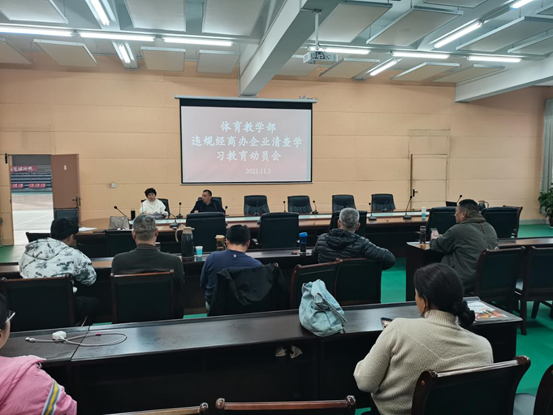为了严格执行《中国共产党廉洁自律准则》《事业单位人事管理条例》有关规定,不断规范体育教学部公职人员廉洁行为,根据校纪委《关于集中开展公职人员违规经商办企业专项清查工作的通知》的文件精神要求,2021年11月4日下午,体育教学部组织召开公职人员违规经商办企业专项清查工作的学习教育动员会,体教部全体教职员工参加了会议。
