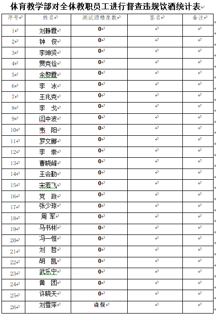 根据中共南阳市纪委《关于严肃作风纪律确保 2021 年元旦春节风清气正的通知》(宛纪文[2020]48 号)文件精神和南阳医专纪委工作部署,体育教学部决定在1月26日下午,对全体工作人员进行一次违规饮酒的突击检查,具体情况通报如下: