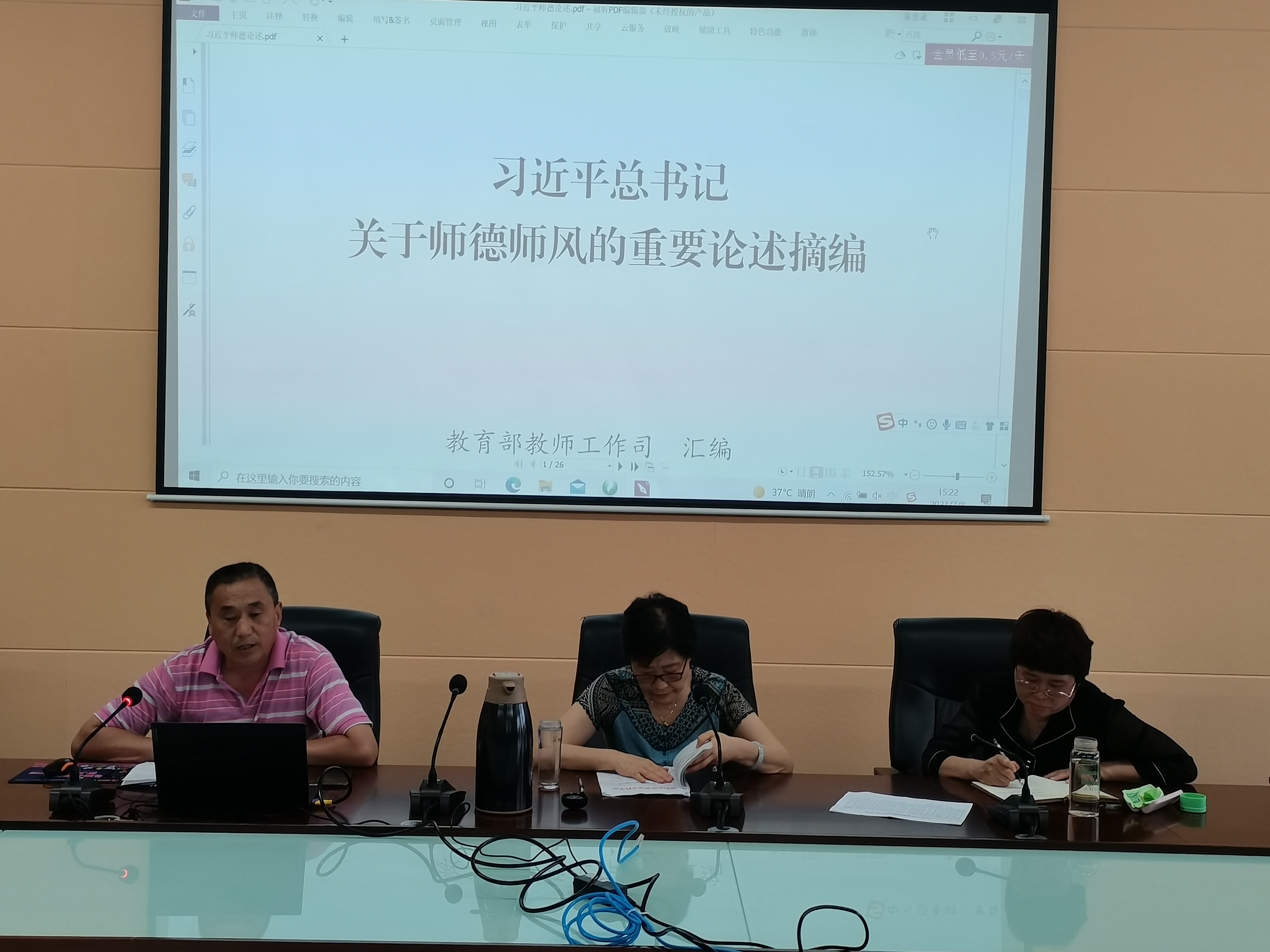 2021年7月8日下午,体育教学部直属党支部在体育馆一楼会议室开展了关于学习“习近平总书记关于师德师风的重要论述摘编”的教育讲座。参与此次总结交流会的人员主要有体育教学部领导班子成员、全体党员、全体教职工参加学习。